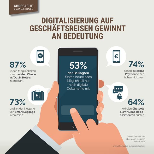 87 Prozent der Geschäftsreisenden finden mobile Check-in/out-Angebot in Hotels interessant. Und 67 Prozent nutzenChabots als virtuelle Reiseassistenten. Sogenanntes „Smart Luggage“ würden 73 Prozent der Geschäftsreisenden gern einmal ausprobieren. Das sind Ergebnisse der aktuellen Umfrage "Chefsache Business Travel 2018", einer Initiative von Travel Management Companies im Deutschen Reiseverband (DRV).