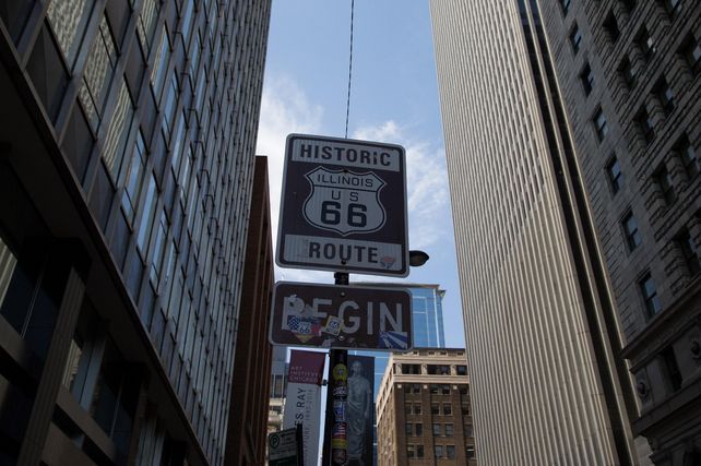Los geht die Reise im Herzen von Downtown Chicago. Ein unscheinbares, aber berühmtes „Route 66 Begin“-Schild auf der Adam Street und gegenüber dem Art Institute of Chicago markiert den Startpunkt. Der Weg führt durch beeindruckende Wolkenkratzerschluchten und vorbei an Chicagos Warenterminbörse, der Chicago Board of Trade. Wer noch nicht gefrühstückt hat, kann dies im kultigen Diner Lou Mitchell's nachholen, dessen Küche schon in den 1920er Jahren so manchen Trucker mit einem herzhaften Frühstück fit gemacht hat für die Fahrt auf der Route 66. Ansonsten lädt auf dem Weg nach Südwesten Dell Rhea’s Chicken Basket in Willowbrook Reisende zu köstlich gebratenen Hühnchen ein.