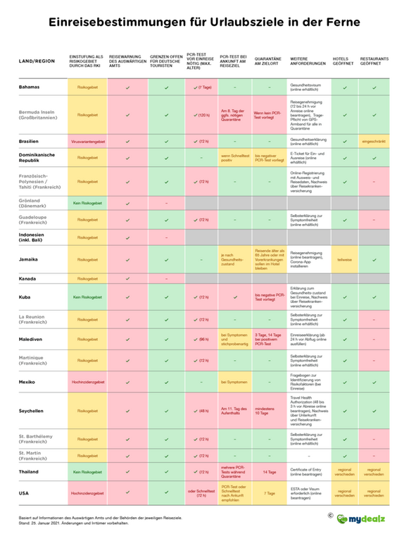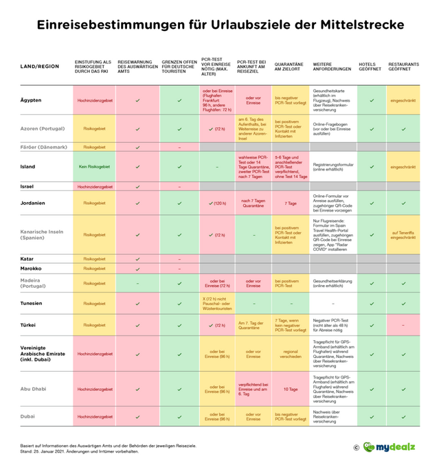 Urlaub im Ausland ist aktuell kaum möglich. Ohne negativen PCR-Test lässt derzeit kaum ein Staat mehr Touristen ins Land. Und auch ein negativer Test ist noch lange kein Freibrief für unbeschwerten Urlaub: Je nach Urlaubsziel müssen sich Reisende darauf einstellen, mindestens die ersten Tage ihres Urlaubs in Quarantäne zu verbringen. Und auch nach der Rückkehr müssen sie sich erst einmal für zehn Tage isolieren, bevor der normale Alltag weitergehen kann. Mydealz hat recherchiert, wohin die Deutschen aktuell eigentlich noch reisen können.