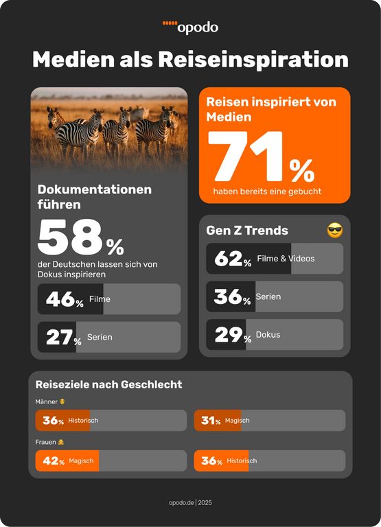 "Die Dominanz der Dokumentationen ist ein klares Alleinstellungsmerkmal. Gleichzeitig beobachten wir einen Wandel bei der jungen Generation: Die Gen Z in Deutschland orientiert sich stärker an internationalen, fiktional geprägten Trends – ein Hinweis darauf, dass sich der Markt in den kommenden Jahren verändern wird," erklärt Reiseexpertin Bettina Lemeßier von Opodo.