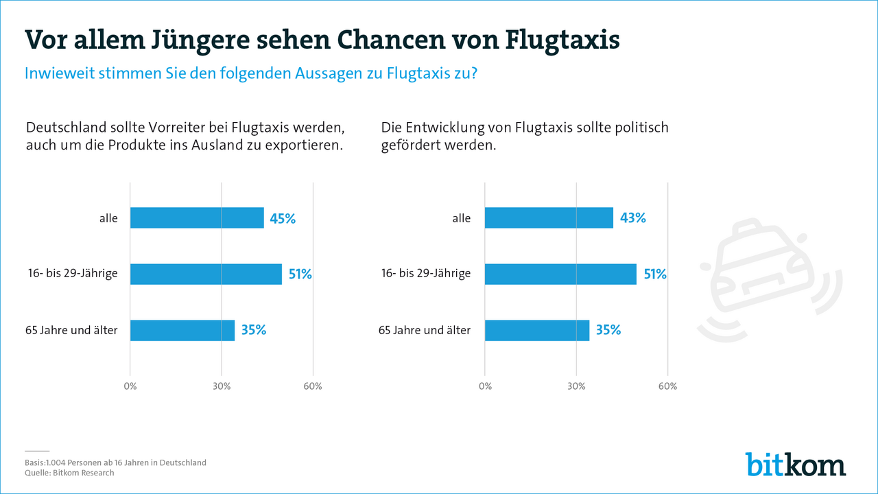 Aus der Innenstadt in wenigen Minuten raus aufs Land ohne im Stau zu stehen – Flugtaxis sollen nach dem Willen von Startups und etablierten Luftfahrtunternehmen schon in wenigen Jahren diese Aufgabe übernehmen. Vor allem jüngere Bundesbürger sehen in Flugtaxis aber nicht nur ein bequemes Verkehrsmittel, sondern eine Chance für die deutsche Wirtschaft. So sagen 51 Prozent der 16- bis 29-Jährigen, Deutschland sollte Vorreiter bei Flugtaxis werden, um die Produkte ins Ausland zu exportieren. In der Gesamtbevölkerung stimmen dem 45 Prozent zu, vor allem die Älteren ab 65 Jahren sind skeptisch (35 Prozent). Das ist das Ergebnis einer repräsentativen Umfrage unter 1.004 Bundesbürgern ab 16 Jahren im Auftrag des Digitalverbands Bitkom.