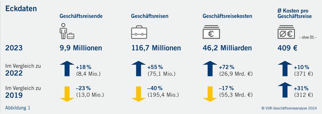 Die deutschen Unternehmen und öffentlichen Institutionen haben sich ihre Geschäftsreisen im Jahr 2023 wieder deutlich mehr kosten lassen. Wie die aktuelle VDR-Geschäftsreiseanalyse 2024 belegt, stiegen die Ausgaben um 72 Prozent im Vergleich zum Vorjahr, das noch stark von den Corona-Auswirkungen geprägt war. Damit wurde seit der Pandemie ein neuer Höchstwert mit 46,2 Milliarden Euro erreicht. Dies geht aus den repräsentativen Ergebnissen hervor, die der Verband Deutsches Reisemanagement e.V. (VDR) unter www.geschaeftsreiseanalyse.de veröffentlichte.