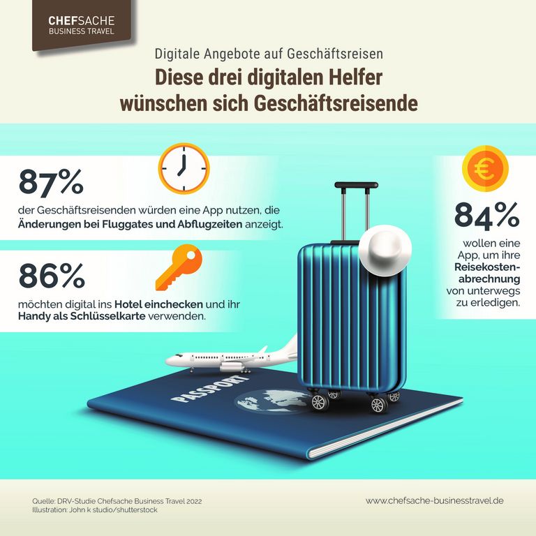 Digitale Lösungen, die das Reisen vereinfachen, werden seit Pandemiebeginn immer beliebter bei Geschäftsreisenden. Auf Platz 1 der Wunschliste steht ein Verspätungswarner, der Änderungen bei Gates und Abflugzeiten übermittelt. Eine solche App würden 87 Prozent aller Geschäftsreisenden nutzen, vor Corona waren es 81 Prozent.