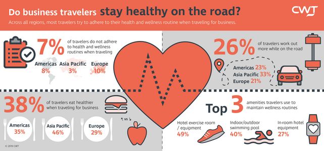 Seit 2017 ist die Einhaltung von Gesundheits- und Fitnessprogrammen auf der Prioritätenliste der Reisenden nach oben geklettert. In allen Regionen stecken sich Geschäftsreisende das Ziel, ihre Gesundheits- und Fitnessprogramme durchzuziehen – ganz gleich, wo auf der Welt sie sich befinden.