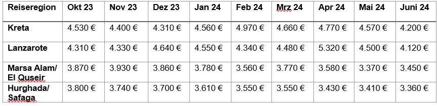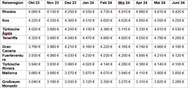 Preistabelle: Preisentwicklung für Familienreisen in den Sommerferien 2024:
