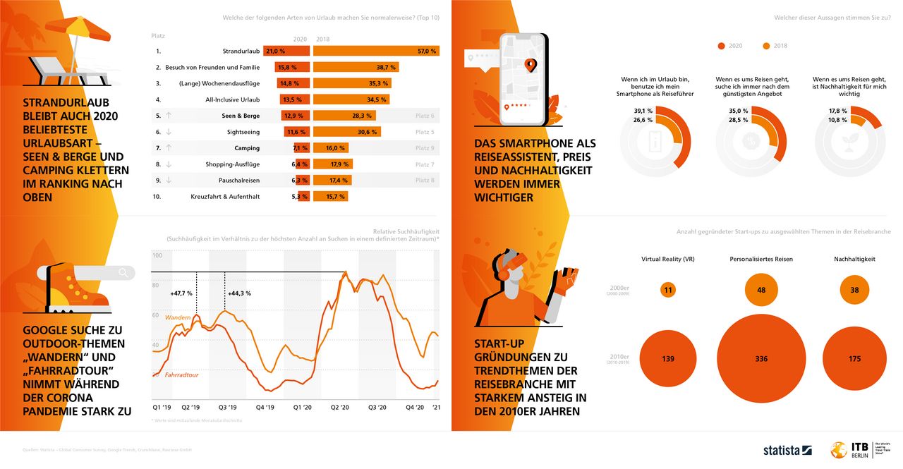 Nach überstandener Pandemie wird in der Reisebranche ein starker Aufschwung erwartet, Reise-Start-ups inklusive neuer Technologien erleben seit Jahren einen Boom und es lassen sich klare Trend-Themen erkennen. Die ITB Berlin und Statista schauen gemeinsam auf neuartige Entwicklungen in der Branche und gehen beispielsweise auf die wachsende Bedeutung des Faktors Nachhaltigkeit ein. Darüber hinaus werden Dauerbrenner-Themen wie der klassische Strandurlaub betrachtet, sodass ein allseitiger Ausblick in die Zukunft der Reiseindustrie entsteht.