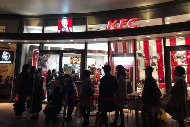 Auch der Besuch der US-amerikanischen Fast Food Kette Kentucky Fried Chicken am Weihnachtstag ist in Japan mittlerweile eine landesweite Tradition. Schätzungsweise 3,6 Millionen Japaner gönnen sich während der Weihnachtszeit frittiertes Hühnchen bei KFC. Der Andrang ist riesig: Vor den Filialen bilden sich am Weihnachtsabend lange Schlangen und das KFC-Weihnachts-Dinner muss teilweise Wochen im Voraus vorbestellt werden. Ursprung dieser Tradition ist eine clevere KFC-Marketingkampagne aus dem Jahr 1974.