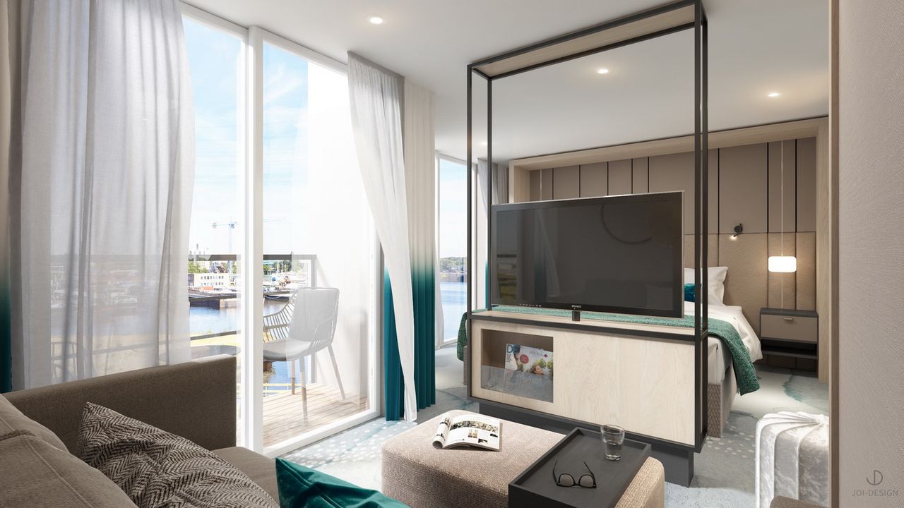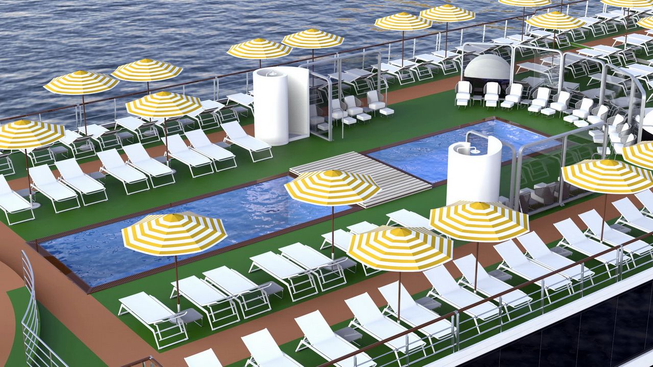 Statt der bisher üblichen Breite von 11,4 Meter weist das Schiff 17,7 Meter auf. Dank eines zusätzlichen vierten Decks präsentiert es sich als Raumwunder mit ausschließlich großzügigen Balkonkabinen außerhalb der Family-Area, einem festen Kids Club sowie einem weitläufigen Sonnendeck mit separatem Erwachsenen- und Kinderpool.