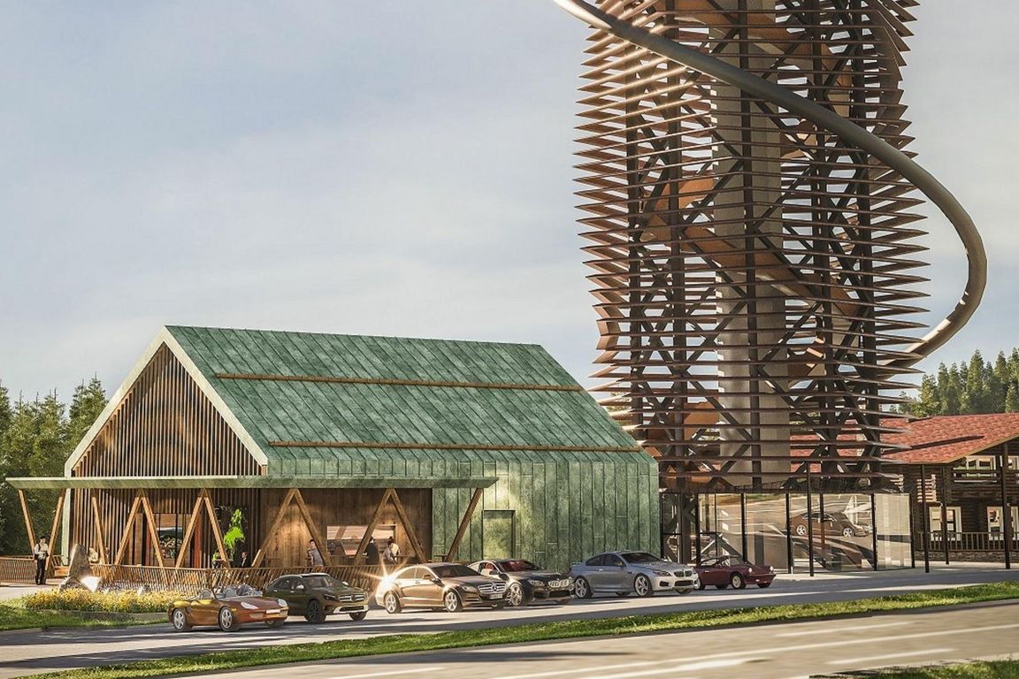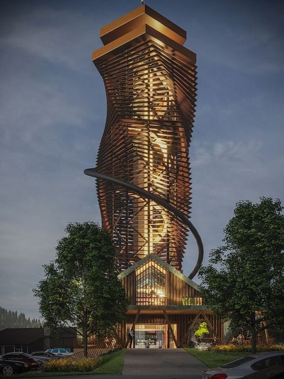 Geplant ist neben 360-Grad-Panorama-Aussichten auch ein gläserner Skywalk in 45 Metern Höhe. Abwärts gehen soll es nicht nur per Treppe oder Lift, sondern auch über eine spiralförmige Rutsche.