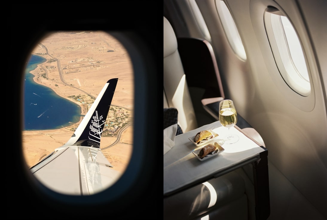 Im Zentrum jeder Reise steht ein speziell ausgestatteter Airbus A321neo-LR mit einer der geräumigsten Kabinen seiner Klasse – exklusiv für 48 Gäste. Eine ausgewählte Crew – bestehend aus einem Journey Concierge, Director of Guest Experience, Executive Chef und einem Bordarzt – sorgt für einen reibungslosen Ablauf vor.