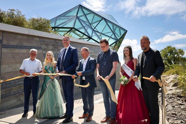 Die Mythoshalle auf der Loreley ist feierlich eröffnet worden. An der Eröffnung nahmen Ministerpräsident Alexander Schweitzer, der Bürgermeister der Verbandsgemeinde Loreley, Mike Weiland, und "Loreley" Katharina Blanckart teil.