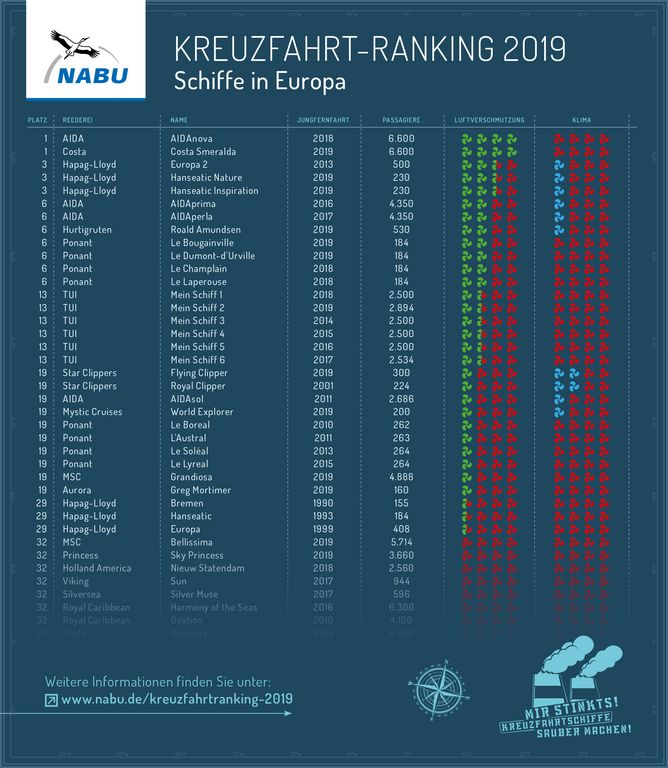 Der Kreuzfahrtmarkt boomt und belastet trotz einzelner Verbesserungen die Luft und auch das Klima zunehmend. Das ist das Ergebnis des NABU-Kreuzfahrtrankings 2019, das der Umweltverband am heutigen Mittwoch in Hamburg vorstellte. Ein kleiner Teil der Flotte wird zwar zunehmend sauberer, das Gros der Branche setzt aber weiterhin auf Schweröl und verzichtet auf den Einsatz von Abgastechnik.