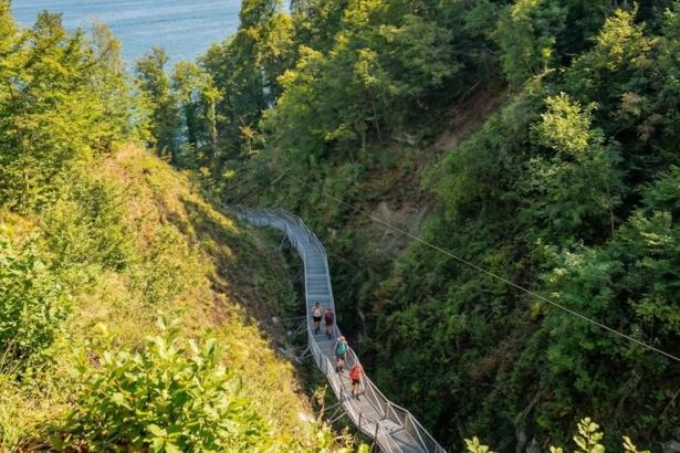 Mehr als 280 Stufen, fünf Aussichtsplattformen und rund 56 Höhenmeter führen durch die Schlucht – vorbei an steilen Felswänden, entlang des tosenden Bachlaufs und mit eindrucksvollen Blicken auf den Bodensee.