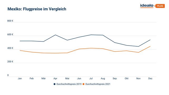 Die Datenerhebung zeigt zwar, dass größere Preistrends, egal ob Preissteigerungen oder Preisdumping, über das gesamte Jahr kaum zu erkennen sind - dennoch ließen sich vor allem für beliebte Sommerziele wie Mallorca oder Mexiko zum Teil deutlich geringere Preise als noch 2019 ermitteln: Für einen Hin- und Rückflug nach Mexiko mussten Reisende in diesem Jahr durchschnittlich 21 Prozent weniger zahlen als noch 2019. Waren Flüge 2019 selten unter 500 Euro zu bekommen, gab es diese 2021 zum Teil schon für unter 350 Euro.