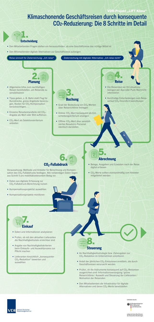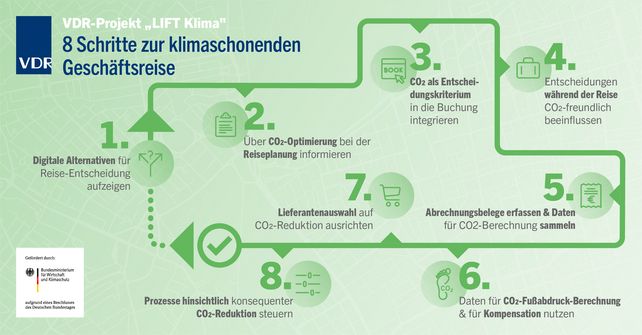 Im Rahmen des Nachhaltigkeitsprojekts „Klimaschonende Geschäftsreisen durch konsequente CO2-Reduzierung" hat der Verband Deutsches Reisemanagement (VDR) ein 8-Schritte-Modell für einen klimaschonenden Geschäftsreiseprozess erstellt. Erläuterungen und Darstellungen zeigen in einem End-to-End-Prozess, wie Unternehmen ihr Travel Management im Hinblick auf umwelt- und klimagerechtes Handeln optimieren und umsetzen können – sowohl kurzfristig als auch langfristig.