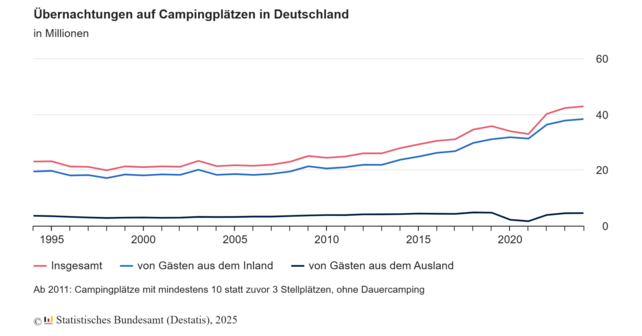 Mit Ausnahme der von Reisebeschränkungen und Beherbergungsverboten geprägten Coronajahre 2020 und 2021 ist die Zahl der Campingübernachtungen in den vergangenen Jahren nahezu kontinuierlich gestiegen. Binnen 20 Jahren hat sie sich verdoppelt: 2004 hatten Campingplätze hierzulande noch 21,4 Millionen Übernachtungen verzeichnet. Zum Vergleich: Die Übernachtungszahlen über alle Beherbergungsbetriebe hinweg sind im selben Zeitraum um 46,4 Prozent gestiegen.