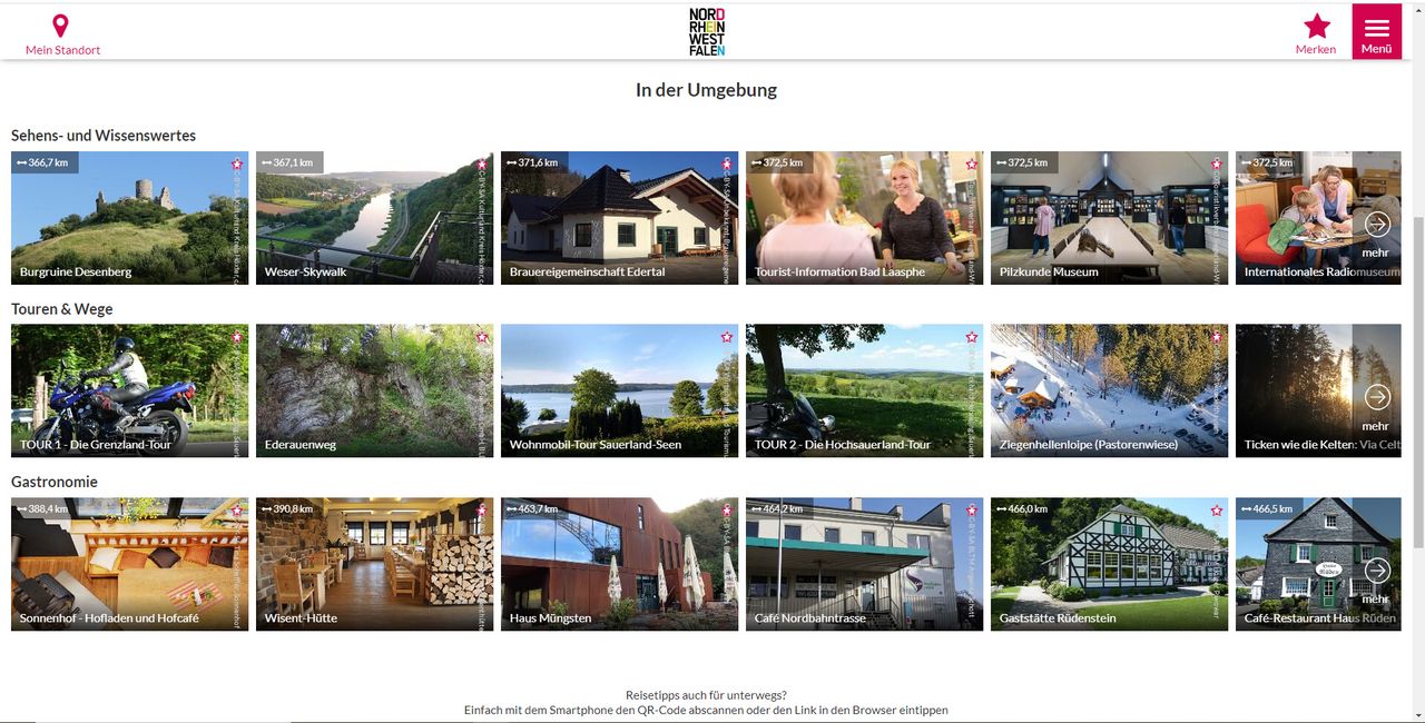 Es geht um Infos etwa zu Ausflugszielen, Wanderrouten und Restaurants, die auf der Webseite «entdecken.nrw-tourismus.de» gebündelt aufbereitet sind - Bürger wissen dadurch, was es in der Nähe oder am Reiseziel so alles gibt. Solche Angebote gibt es zwar schon im Netz, «Dein NRW» soll aber besonders umfassend und präzise sein. Derzeit sind 1500 Datensätze frei verfügbar, bis Jahresende sollen es 15 000 sein - hinzu kommen zum Beispiel noch Infos zu Unterkünften und zum Nahverkehr.