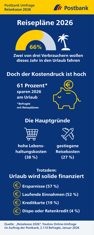 Die wirtschaftlichen Unsicherheiten und die Preissteigerungen der vergangenen Jahre beeinflussen das Reiseverhalten der deutschen Verbraucher im Jahr 2026 maßgeblich. Laut der aktuellen YouGov-Umfrage „Reisekasse 2026“ im Auftrag der Postbank planen zwar zwei von drei Befragten (66 Prozent) eine private Urlaubsreise, doch ein Großteil sieht sich zu Einsparungen gezwungen. Während 40 Prozent der Umfrageteilnehmer mehrfache Reisen beabsichtigen, planen 26 Prozent eine einzelne Reise ein. Demgegenüber stehen 14 Prozent der Befragten, die aus finanziellen Gründen nicht verreisen können, sowie knapp 9 Prozent, die grundsätzlich auf Urlaub verzichten.