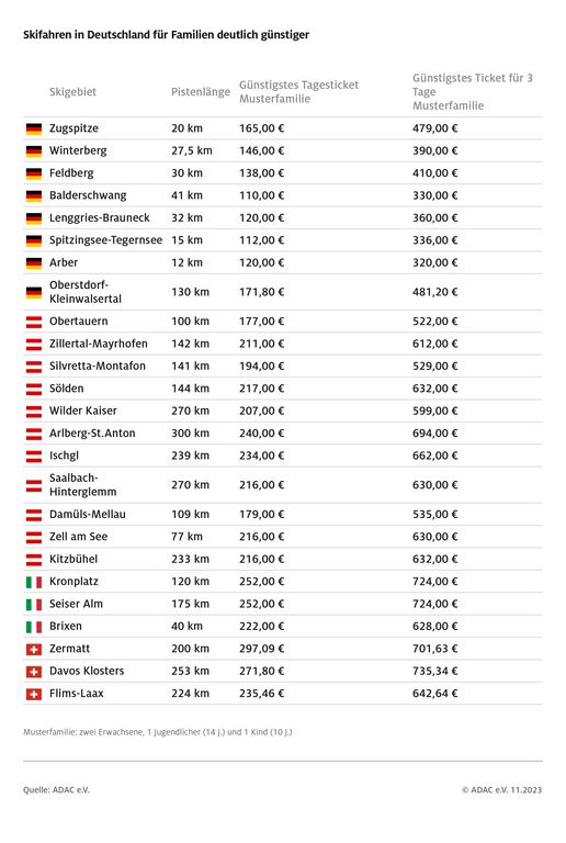 Immerhin in elf Skigebieten kostet der Tagesskipass für eine Familie unter 200 Euro. Den günstigsten Tagesskipass im ADAC Vergleich bekommt man in Balderschwang im Allgäu mit 110 Euro. Am tiefsten müssen Skifahrer in Zermatt in die Tasche greifen, hier kostet der Tag knapp 300 Euro. Betrachtet man die Einzeltickets, liegen die deutschen Skigebiete ebenfalls preislich gut im Rennen. Hier zahlt ein Erwachsener für ein Tagesticket durchschnittlich 49 Euro. Im Vergleich dazu kostet der Tagespass für einen Erwachsenen in Österreich 69 Euro, danach folgen Italien (71 Euro) und die Schweiz (88 Euro).