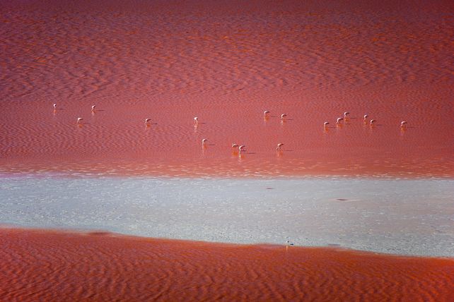 Im Südwesten Boliviens auf einer Höhe von über 4.200 Metern im Nationalpark Eduardo Avaroa liegt die Laguna Colorada – ein Salzsee, der seinen Namen aufgrund seiner rötlichen Färbung trägt. An seiner tiefsten Stelle sind es nur anderthalb Meter bis zum Grund. Je nach Tageszeit und Sonneneinstrahlung leuchtet dieses Naturwunder in einem anderen Rotton.