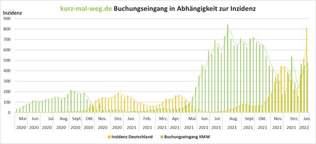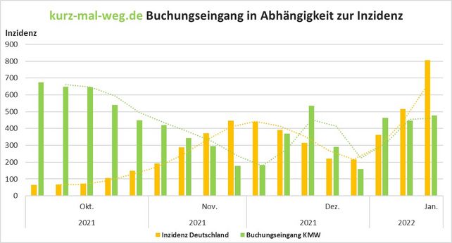 Als Hoffnungsschimmer zeigt sich die aktuell positive Entwicklung beim Kurzreisen-Portal kurz-mal-weg.de (KMW): „In den vergangenen zwei Jahren konnten wir eine starke Abhängigkeit zwischen der Inzidenz und unserem Buchungseingang beobachten. Sobald sich die Fallzahlen erhöhten, ging der Buchungseingang zurück. Entspannte sich die Lage wieder, stieg die Buchungsnachfrage rasant“, so Stephan Kloss, Geschäftsführer von kurz-mal-weg.de.