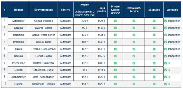 Von Stockholm in Schweden nach Turku in Finnland übersetzen kostet etwa 0,14 Euro. Andere Verbindungen unter 0,30 Euro pro Kilometer sind Kopenhagen–Oslo (0,23 Euro/km), Genua–Palermo (0,26 Euro/km), Stockholm–Helsinki (0,29 Euro/km) und Karlskrona, Schweden–Gdynia, Polen (0,29 Euro/km).