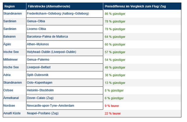 • Die Fähre ist im Vergleich zum Flug oft günstiger, im Durchschnitt 49 Prozent.