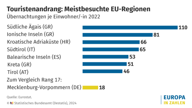 In der Region mit Inseln wie Santorin oder Mykonos kamen 2022 im Durchschnitt 110 Übernachtungen auf eine Einwohnerin oder einen Einwohner, wie das Statistische Bundesamt (Destatis) auf Basis von Daten der EU-Statistikbehörde Eurostat mitteilt.