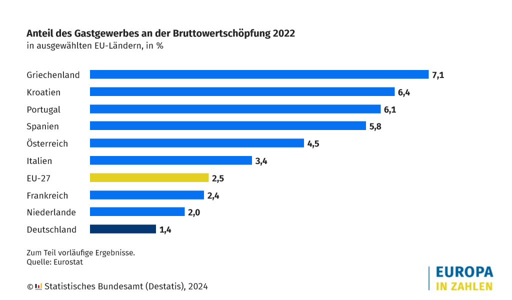 Der Tourismus ist für viele Staaten ein wichtiger Wirtschaftsfaktor. EU-weit den größten Anteil an der Bruttowertschöpfung im jeweiligen Land hatte das Gastgewerbe 2022 nach Eurostat-Daten in Griechenland mit 7,1 Prozent. Dahinter folgten Kroatien (6,4 Prozent) und Portugal (6,1 Prozent). Spanien kam auf einen Anteil von 5,8 Prozent. In Deutschland machte das Gastgewerbe dagegen nur 1,4 Prozent der Bruttowertschöpfung aus. Im EU-Schnitt lag der Anteil bei 2,5 Prozent.