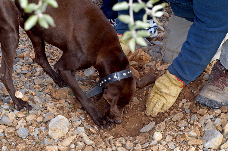 Für die Ernte braucht die Familie 30 Trüffelhunde. «Wir haben sie zwar gut trainiert. Sie führen uns immer zu den reifen Exemplaren. Doch Hunde verlieren meistens nach ein oder zwei Stunden die Lust an der Suche», erzählt Alba. «Dann müssen wir einen neuen Hund von der Finca holen. Ohne sie geht gar nichts. Eine Maschine, welche Trüffel findet und dabei auch noch die reifen erkennt, wurde leider noch nicht erfunden.» Monte bekommt seine Belohnung: ein Stück Wurst.