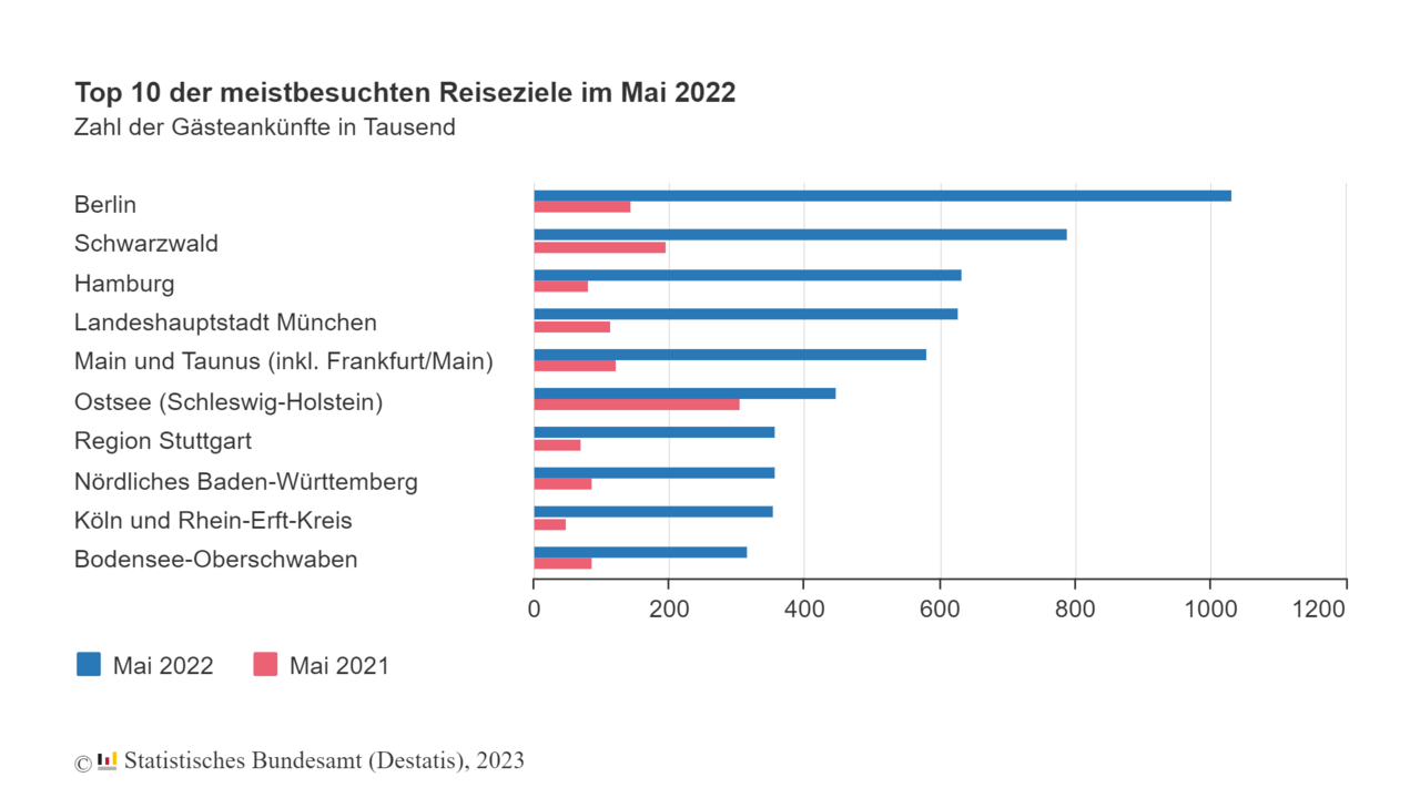 Auch abseits der Hauptstadt reisten die Menschen im vergangenen Mai wieder vermehrt in die großen deutschen Städte. In der Rangliste der zehn meistbesuchten Reiseziele waren die sechs größten Städte Deutschlands vertreten: Auf Berlin folgten im Ranking der meistbesuchten Großstädte Hamburg, München, die Metropolregion Main und Taunus mit der Stadt Frankfurt am Main, die Region Stuttgart sowie Köln mit dem Rhein-Erft-Kreis. Die meistbesuchte ländliche Region war der Schwarzwald mit gut 790 000 Übernachtungsgästen im Mai 2022, gefolgt von der Ostsee in Schleswig-Holstein.