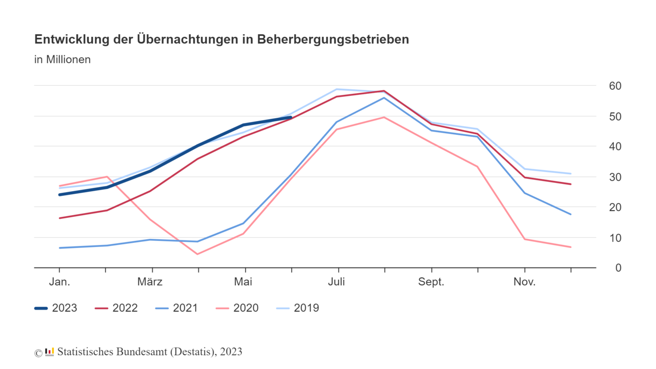 Die Zahl der Übernachtungen von Gästen aus dem Inland sank im Juni 2023 gegenüber dem Vorjahresmonat leicht um 1,1 Prozent auf 42,0 Millionen. Das waren 1,0 Prozent weniger Übernachtungen als im Juni 2019. Die Zahl der Übernachtungen von Gästen aus dem Ausland erhöhte sich im Vergleich zum Vorjahresmonat um 15,7 Prozent auf 7,5 Millionen, lag damit aber noch 8,7 Prozent unter dem Vorkrisenniveau von Juni 2019.