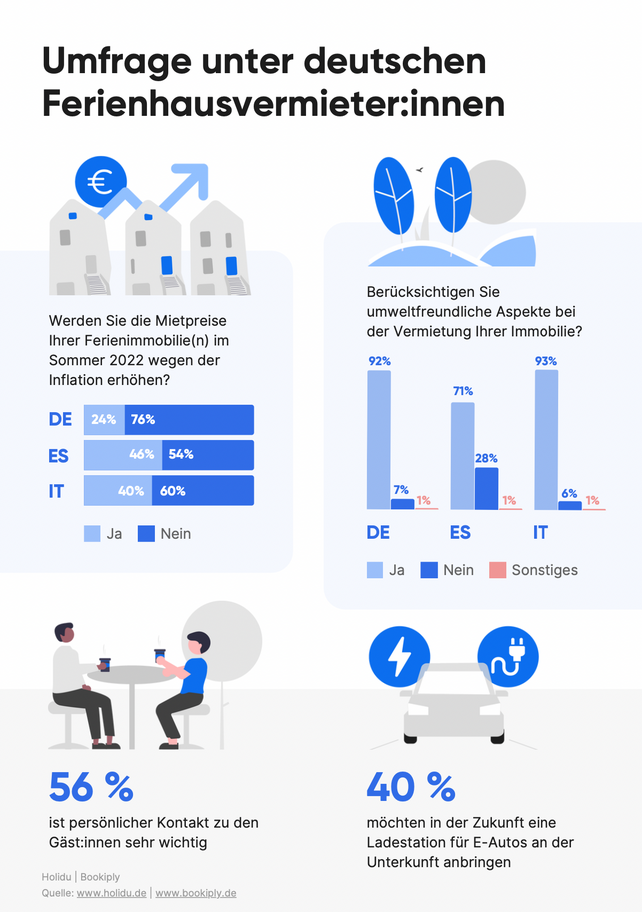 Die Inflation hat in diesem Sommer vieles in beliebten Urlaubsländern verteuert. Das Ferienhaus-BuchungsportalHolidu (www.holidu.de) und seine TochtergesellschaftBookiply (www.bookiply.de), die sich mit Software- und Service an Ferienhausvermieter richtet, haben eine Umfrage unter 1.230 Ferienhausvermietern in Deutschland und dem Voralpenraum, Spanien und Italien zur Inflation durchgeführt. Zudem wurden die Gastgeber zu Nachhaltigkeit und Kontakt mit den Gästen befragt.