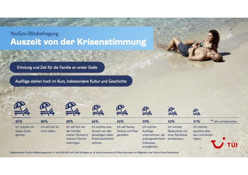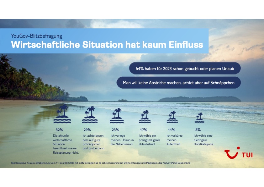 Die Buchungskurve zeigt bei TUI deutlich nach oben und bestätigt die Umfrageergebnisse. „Wir sehen für den kommenden Sommer eine hohe Reisebereitschaft. Die Nachfrage nach Urlaubsreisen liegt bereits über den Vorjahreswerten. Sie möchten sich und ihrer Familie etwas gönnen und möglichst keine Abstriche beim Urlaub machen“, so Baumert. TUI bleibt optimistisch bei den Erwartungen und rechnet insgesamt mit einem guten Reisejahr in 2023.
