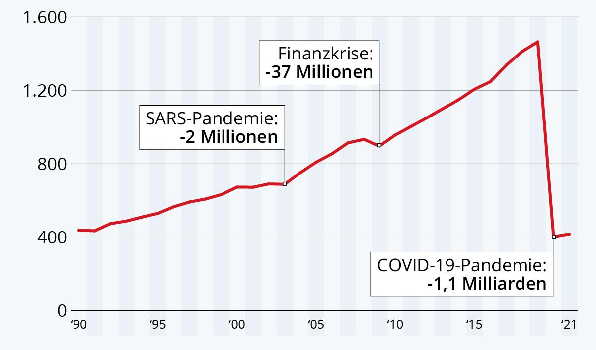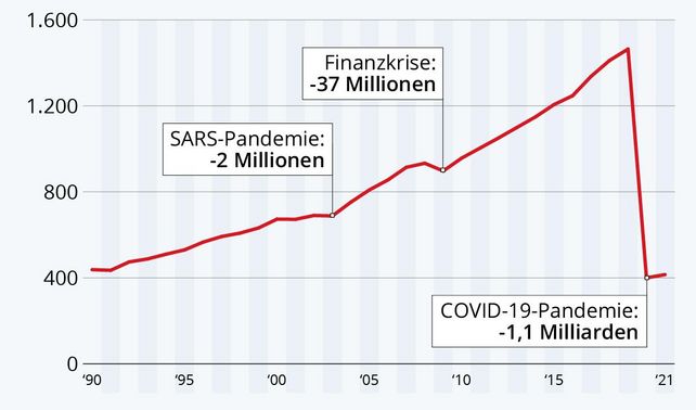 Vor Covid-19 eilte der internationale Tourismus von Rekord zu Rekord - lediglich die erste SARS-Pandemie (2003, -0,4 Prozent)) und die Finanzkrise (2009, -4 Prozent) schafften es kleine Dellen im Aufwärtstrend zu hinterlassen. Reisten zur Jahrtausendwende 674 Millionen Menschen um den Globus, waren es 2019 rund 1,5 Milliarden.