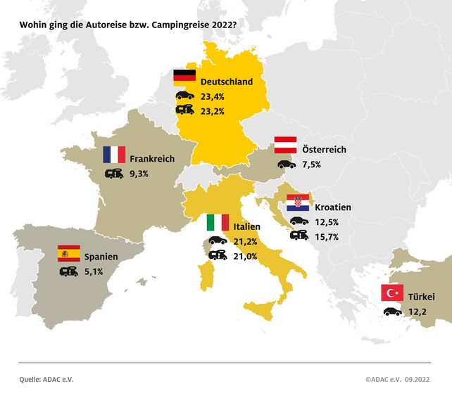 Beim Campingurlaub zeigt sich nach der ADAC Auswertung ein ähnliches Bild. Deutschland rangiert mit 23,2 Prozent vor Italien (21%) und Kroatien (15,7 %).