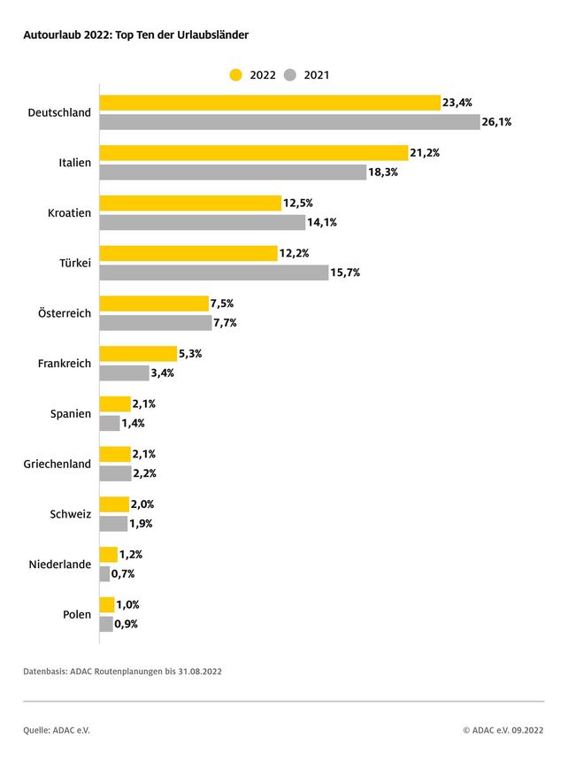 Eine Auswertung des ADAC von rund 500.000 Routenanfragen der Mitglieder zeigt, dass knapp 24 Prozent der Auto-Urlauber ihre Ferien in Deutschland verbracht haben. Allerdings waren es weniger als in den Jahren zuvor (2019: 29,3%, 2020: 30,9%, 2021: 26,1%).