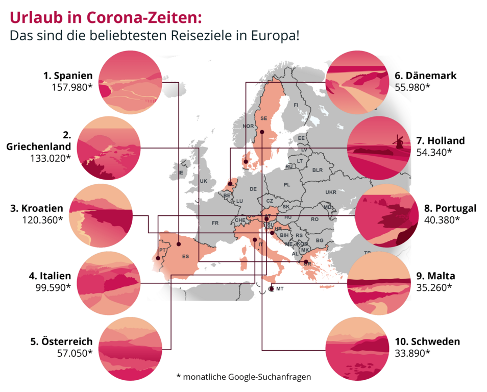 Die weltweite Reisewarnung weicht ab dem 15 Juni für 29 EU-Länder allgemeinen Reisehinweisen. Für Fernreisen außerhalb der EU gilt die Reisewarnung hingegen weiterhin bis mindestens zum 31. August. Für alle, die in diesen turbulenten Zeiten verständlicherweise nach einer Auszeit lechzen, hat die Vergleich.org-Redaktion die beliebtesten Urlaubsziele innerhalb Europas anhand der monatlichen Suchanfragen zusammengetragen.