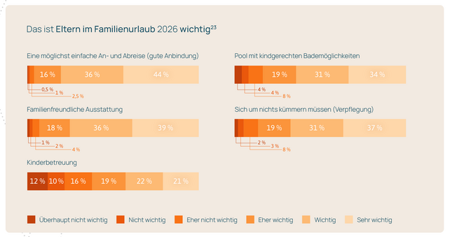 Als wichtigstes Kriterium bei der Buchung eines Familienurlaubs gilt für 96 Prozent der befragten Eltern eine möglichst einfache An- und Abreise. Darauf folgen familienfreundliche Ausstattung und die Option, sich um nichts kümmern zu müssen (wie Verpflegung). Die Kinderbetreuung ist das am wenigsten wichtige Kriterium, das von rund 12 Prozent als „überhaupt nicht wichtig“ eingestuft wird.
