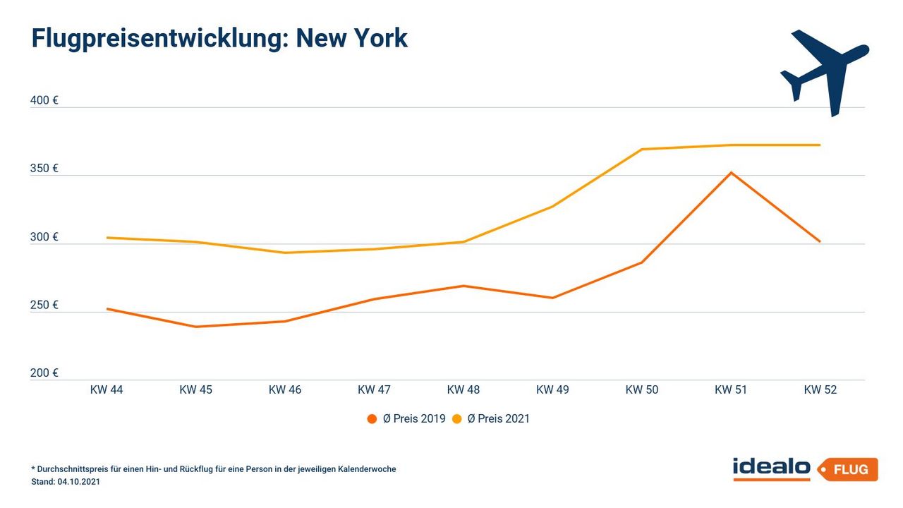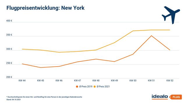 Preislich müssen Reisende nach New York in diesem Jahr tiefer in die Tasche greifen als noch 2019. Für die Weihnachtswoche (Kalenderwoche 51) liegt der durchschnittliche Preis für einen Hin- und Rückflug zum Zeitpunkt der Datenabfrage bei 372 Euro und damit fünf Prozent über dem von 2019. Wer über Silvester nach New York fliegen will, muss aktuell circa 23 Prozent mehr zahlen als 2019 (372 Euro anstatt 301 Euro).