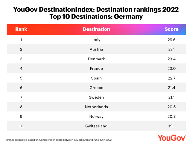 Verantwortungsbewusste Reisende sind jene, die auf Wohlbefinden fokussiert, auf Umweltauswirkungen achtend und kulturbewusst sind. Das vorliegende Ranking schaut sich auf Grundlage des YouGov DestinationIndex in insgesamt 25 getrackten Märkten an, welche Länder jene Reisenden in den vergangenen 12 Monaten als Reiseziel in Betracht gezogen haben. Italien ist dabei unter den verantwortungsbewussten Reisenden in Deutschland das beliebteste Reiseziel: Knapp 30 Prozent der Zielgruppe haben das Land von Juli 2021 bis Juni 2022 in Betracht gezogen. Die deutschen Nachbarländer Österreich (Rang 2 mit 27 Prozent) und Dänemark (Rang 3 mit 23 Prozent) reihen sich direkt hinter Italien ein.