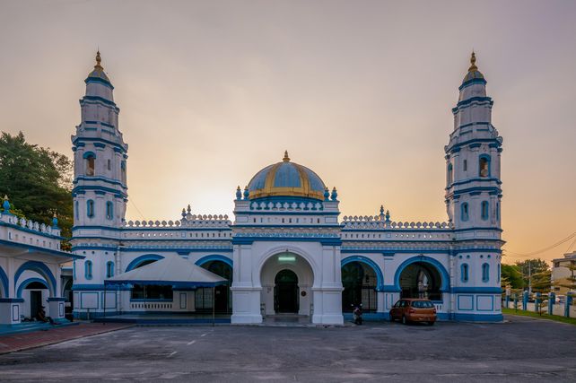 Eine Farbwelt aus Weiß und Blau, den zarten Schattierungen des Himmels – so präsentiert sich die Masjid Panglima Kinta im malaysischen Ipoh. Das Schmuckstück der islamischen Architektur strahlt eine Leichtigkeit aus, die sich perfekt in das entspannte Flair der südostasiatischen Stadt einfügt. Das wunderschöne Bauwerk wurde im Jahr 1898 zu Ehren eines malaysischen Kriegers erbaut, der für seine Heimatstadt kämpfte und es ist eines der ältesten in der ganzen Region. Masjid Panglima Kinta befindet sich direkt am Kinta River im Zentrum von Ipoh. Besucher können die Moschee nur schwer übersehen, bereits aus der Ferne ragen eine golden verzierte Kuppel und zwei Turmspitzen empor.
