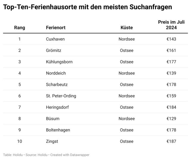 Die meisten Suchanfragen für einen Sommerurlaub an Deutschlands Küsten entfallen auf das Nordseeheilbad Cuxhaven an der Nordsee mit seinen kilometerlangen Stränden. Ferienunterkünfte kosten dort durchschnittlich 143 Euro pro Nacht. Auf dem zweiten und dritten Platz liegen die Ostsee-Städte Grömitz (161 Euro) und Kühlungsborn (177 Euro). Das teuerste der zehn Trend-Ziele ist das Ostseeheilbad Zingst, wo 187 Euro pro Nacht und Unterkunft fällig werden.