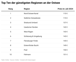 Am günstigsten übernachten Ostsee-Urlauber in der NOK-Region (110 Euro), also am Nord-Ostsee-Kanal, und an der südlichen Ostseeküste (115 Euro) sowie in den Gebieten rund um Stralsund (137 Euro) und Schleswig (143 Euro). Auch die Inseln Poel und Fehmarn sind im Juli mit je rund 150 Euro recht preiswert.