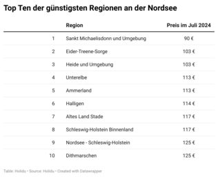 An der Nordsee kostet eine Ferienunterkunft im Juli durchschnittlich 150 Euro pro Nacht. Doch je nach Region fallen die Kosten deutlich höher oder niedriger aus: das teuerste Reiseziel ist die Insel Juist, wo eine Ferienunterkunft stolze 270 Euro pro Nacht kostet, gefolgt von Spiekeroog (243 Euro), Langeoog (234 Euro), Wangerooge (219 Euro) und Sylt (217 Euro). Günstiger ist es auf den Inseln Norderney (177 Euro), Amrum (166 Euro) und Borkum (155 Euro).