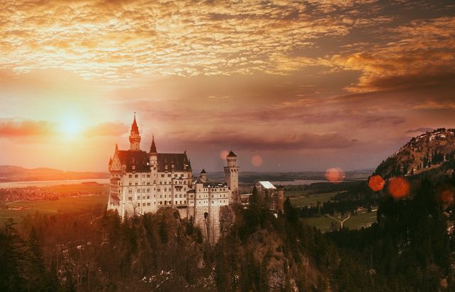 In den Prunkräumen funkeln Edelsteine, Gold und Glas. Wände sind mit Szenen aus Lohengrin und Parzival bemalt, mit Rittern und Heiligen. Durch die Außenfassade im weißen Kalkstein glich Ludwigs Kunstwerk immer mehr einem hübschen Schwan, der sich langsam in die Höhe reckt. Das romantische Gebäude wurde ein Kontrast zur industriellen Revolution – und vermutlich zu Ludwigs Verhängnis.