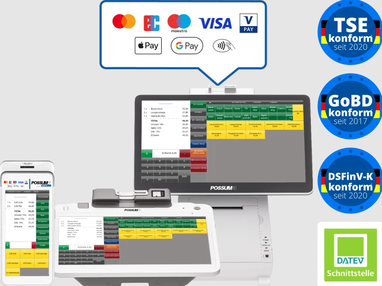 All-in-One Kassensystem mit integriertem EC-Kartenlesegerät für den Einzelhandel, die Gastronomie und weitere Branchen. POSSUM ist eine All-in-One Kassen-Hardware mit integrierter Payment-Funktion und Kassen-Software.