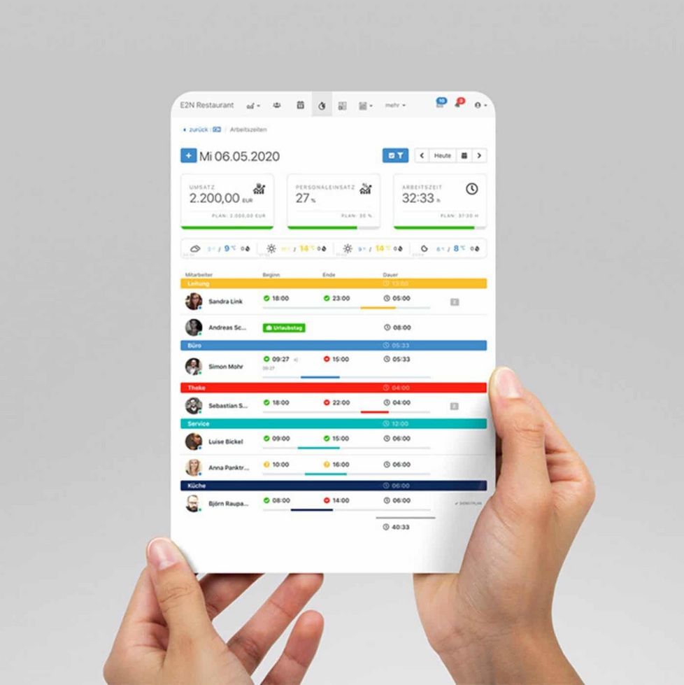 e2n ist eine Cloud-Software, die Gastronomen und Hoteliers beim Mitarbeitermanagement unterstützt. Sie vereint Personalverwaltung, Zeiterfassung und Dienstplanung in einem System. Mit Hilfe einer Controlling-Funktion behalten Verantwortliche den Überblick über Umsatz, Dienstplan und Zeiterfassung.