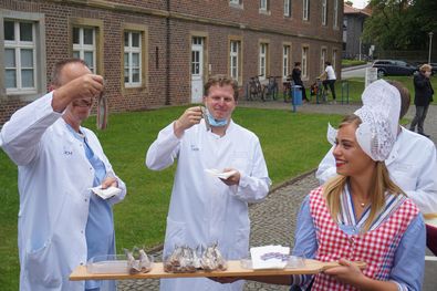 Der Minister für das niederländische Gesundheitswesen und der Vorsitzender des niederländischen Netzwerks Intensivpflege haben eine besondere Dankbezeugung nach Deutschland überbracht: Als Dank für die Aufnahme vieler niederländischer Corona-Patienten gab es ein Fass Matjes.