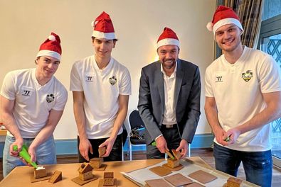 Die Kinder aus dem benachbarten Kastanienhof wurden von Stürmer Lukas Wagner und den Verteidigern David Trinkberger und Maximilian Leitner der Krefeld Pinguine überrascht. Gemeinsam waren sie in der hauseigenen „Weihnachtsbäckerei“ des Hotel Krefelder Hof zu Gast.
